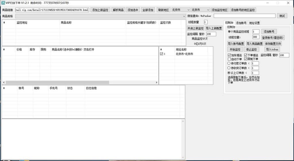 外面收费2580的唯品会脚本,脚本主要功能为自动监控唯品会的商品,全自动下单扫货,抢货搬砖必备神器脚本