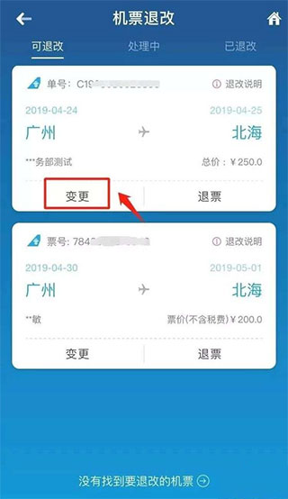2、点击“机票退改”,在可退改的机票中选择需要改签的机票,选择“变更”。