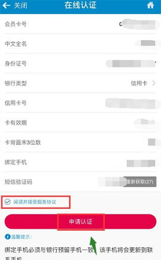 6、按要求输入你的银行卡信息,并用银行卡手机号完成验证,勾选协议,点击申请认证按钮,如下图所示