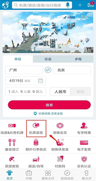 1、打开软件后,首页就能找到“机票退改”。