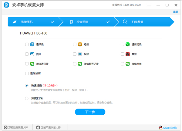 2、连接成功之后会自动跳转到数据类型模式,本文要恢复的是手机删除的照片,所以在类型中勾选照片即可。点下一步,软件将进入对照片的扫描,