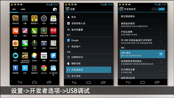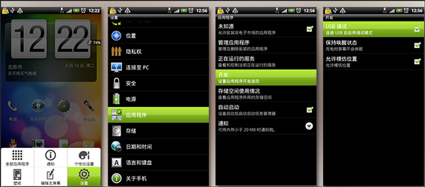 进入设置界面的 应用程序 即可打开 USB调试模式