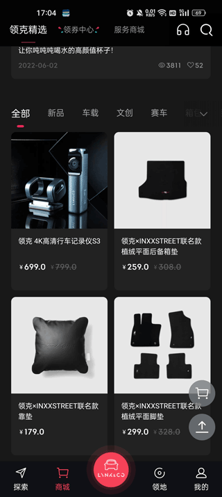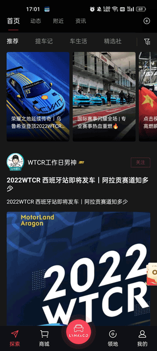 2、点开首页,我们可以看到领克汽车的各种赛事资讯以及领克车主的生活分享,车主也可以在这里分享自己的车辆日常