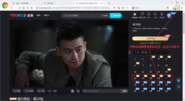 6、这个时候就可以在浏览器上打开视频网站,就可以免费观看各种VIP和收费资源了,播放视频是图示需要登录或者是开通会员的话,点击右上角的图标或者是切换VIP集数就可以得到解决。