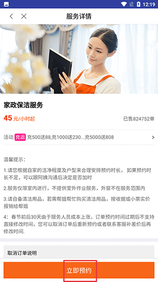 三、将信息填写完成后,点击立即预约后就可以等待阿姨上门了。