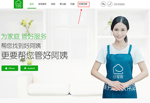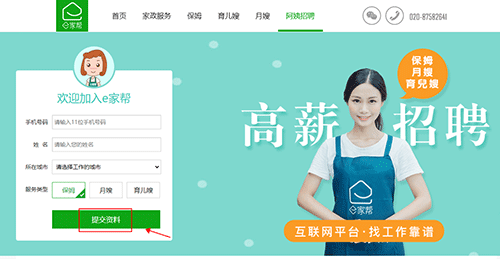 一、打开e家帮家政服务app官方网站,点击阿姨招聘。