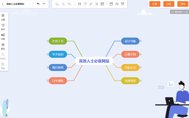 GitMind是一款在web+PC+iOS+Android+小程序五大平台通用的思维导图软件,你只需登录了账户,各端都可以内容同步,每一次的操作都会实时保存,上班没做完的内容回家的路上还可以继续使用移动设备编辑,非常方便~