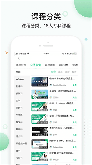 提供多种科室学习课程:心脏科、眼科、肿瘤科、内科、麻醉科、中兽医、兽医助理、急救