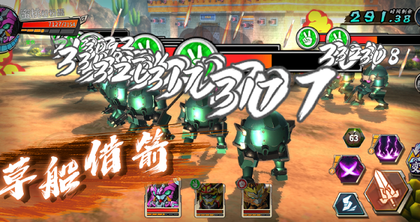 果宝三国中经典的诸葛亮草船借箭,在游戏中变成了一次性大范围箭雨AOE,对大量敌人造成密集伤害。