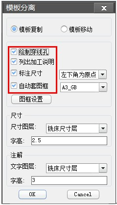 模具总装图绘制完成后,可自动拆分出模板图,绘制穿孔、列出加工说明、标注模板尺寸、以及自动套图框。