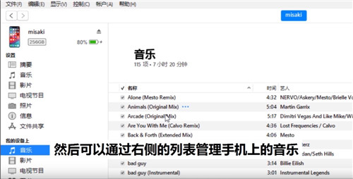 2、然后可以通过右侧的列表管理手机上的音乐;
