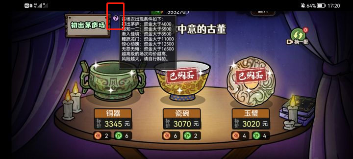点问号,对于新手(胆小的)来说,初出茅庐场是非常非常适合滴(比如我这个既想赚钱钱又想开心的抠门鬼)!点击换一批就可以刷到,要是刷到无怨无悔场,立马再点一次(比如我这个蠢货买了个黑心赝品,真是离谱的惊心动魄)!