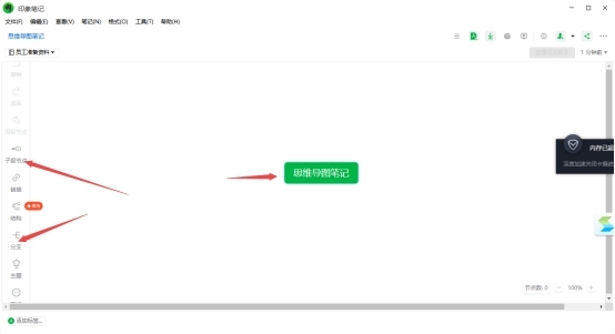 2、接着软件就会弹出思维导图笔记的新建界面了,同时界面当中会出现一个【思维导图笔记】的同级节点按钮。同时在界面的左侧,我们可以看到【同级节点】、【子级节点】的添加按钮,我们可以通过点击这些按钮,来为思维导图笔记添加新的节点。