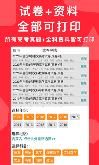 1、可以查询指定年限的高考试卷,在线浏览各个地区的高考试题原卷。