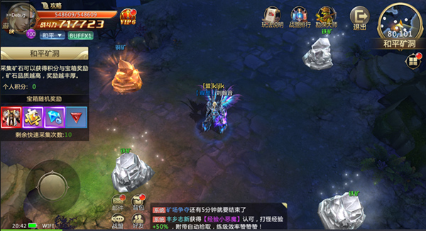 和平矿洞是混沌起源的特色玩法,每天24小时无时限进入,玩家可以在矿洞内采集矿场资源,获得宝藏碎片和极品装备,宝藏碎片可以合成寻宝钥匙,免费寻宝!和平矿洞为和平地图,不可PK!矿洞内有各种矿石,每天无限刷新,可以无限采集