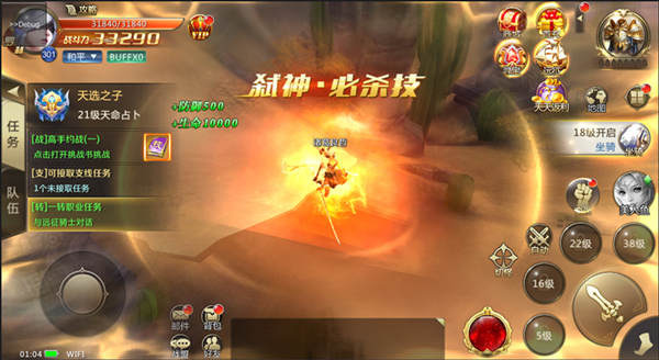 弑神系统是特色玩法,通过弑神技能,玩家可以获得短暂的高额属性加成。PK打怪无人能挡。弑神技能还可以升级,完成系列弑神任务即可升级,升级后可以获得更强力的加成,并且伴随效果改变。由火焰效果变成冰霜效果。弑神游戏表现华丽夸张,动感十足,小伙伴们快来体验吧