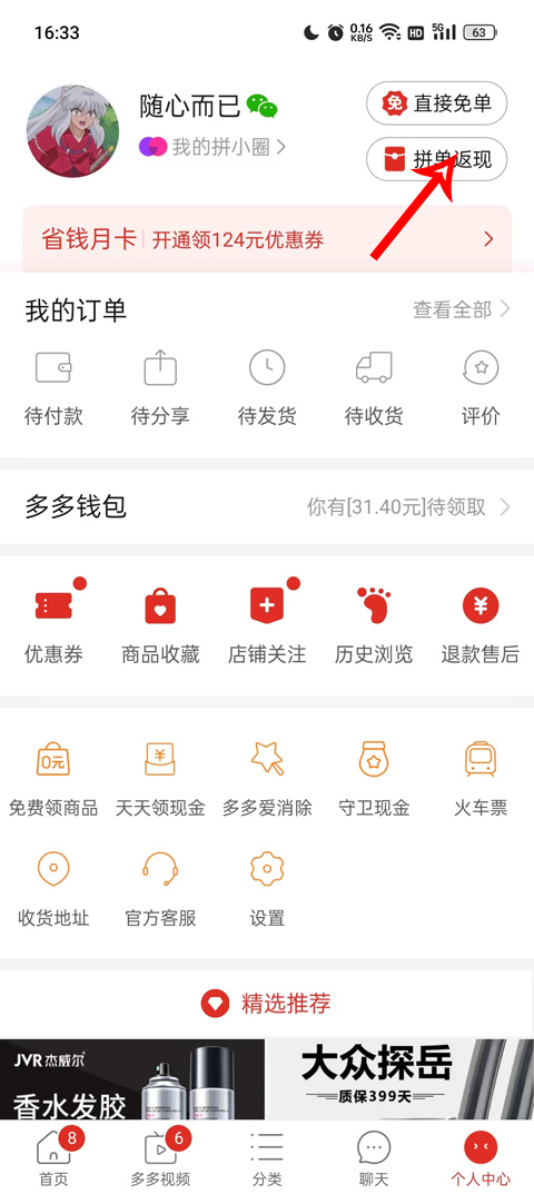 2、进入到个人中心页面之后,在右上角有一个拼单返现,点击进入;