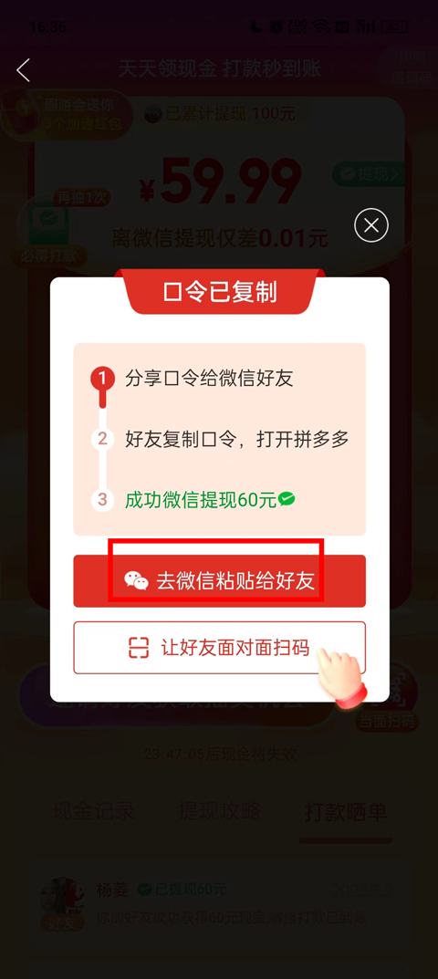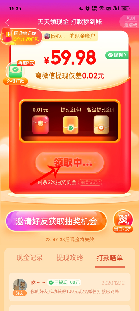 3、当我们还差金币提现的时候,可以选择邀请好友打开,可以获得一次抽奖机会,当金币到达60元时,就可以直接进行提现了。
