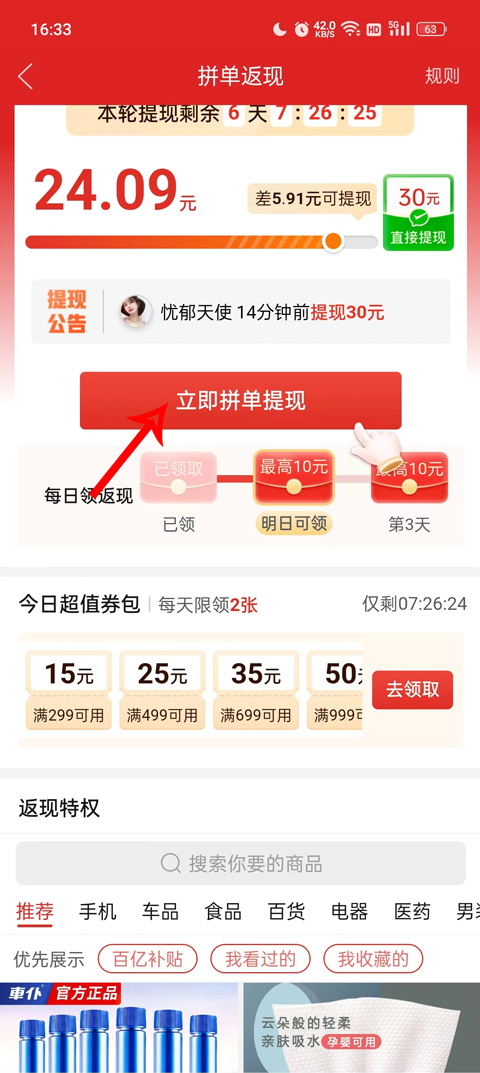 3、点击立即拼单提现,拼单购买下方的商品,将返利金额达到30元之后就可以立即提现了。