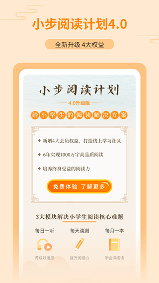 每日一听、每天读测、每月一本,三大模块,每天45分钟,小学六年完成1000万字高品质阅读。