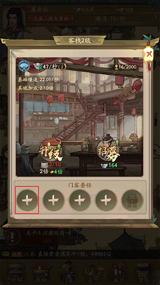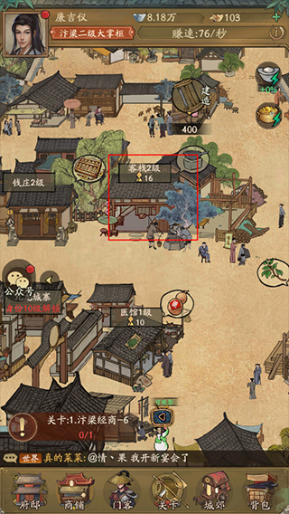 1、打开叫我大掌柜手游,进入游戏界面,点击下方的“商铺”按钮,进入商铺页面,在此页面点击需要委任门客的商铺进入;