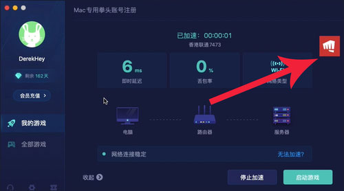 4、在加速详情页点击右侧的拳头图标(请不要点击启动游戏按钮!)