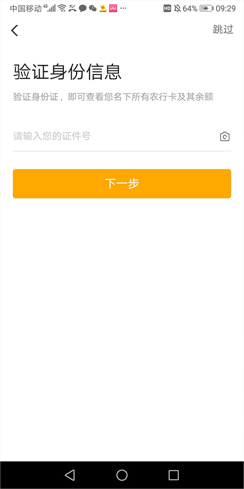 4、验证成功后就会进入身份验证页面,在该页面中用户只要输入证件号(一般就是在农行开通账户时所用的身份证号)后点击【下一步】即可匹配到个人在农行所开通的账户信息
