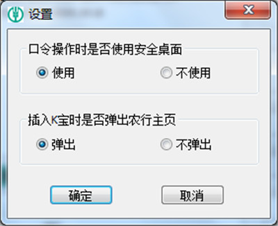 用户可以通过点击“系统设置”按钮,来选择是否开启“口令操作时是否使用安全桌面”和“插入K宝时是否弹出农行主页”的功能。如图所示: