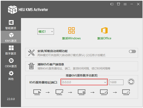 搭建KMS服务器[手动激活]:KMS服务器地址/端口。