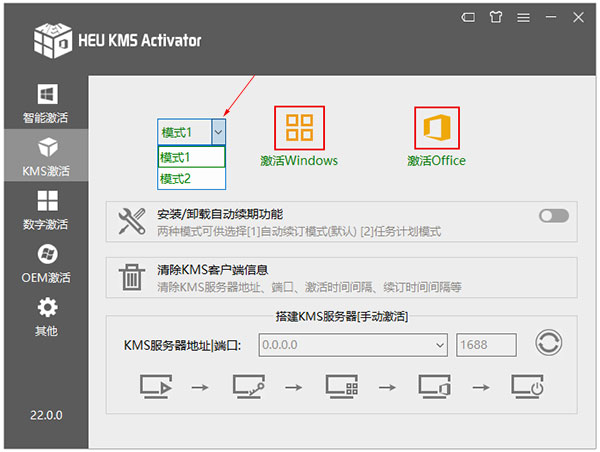 1、KMS 激活:可选择“模式 1/模式 2”,使用 KMS 进行激活 Window 和 Office,点击“橘黄色按钮『激活 Windows』、『激活 Office』”即可。