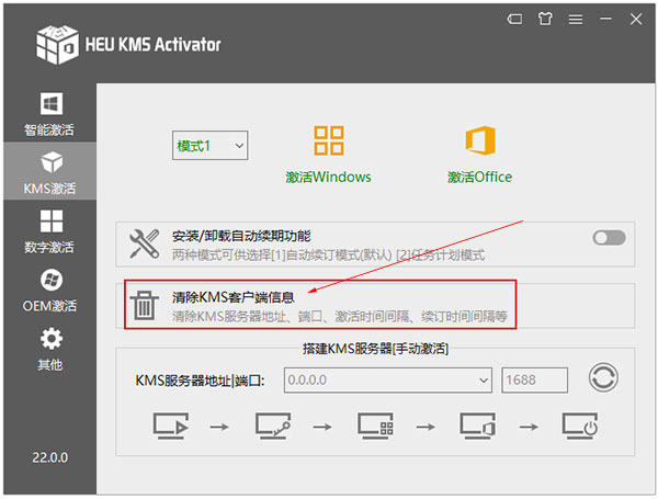 清除KMS客户端信息:清除KMS服务器地址、端口、激活时间间隔、续订时间间隔等。