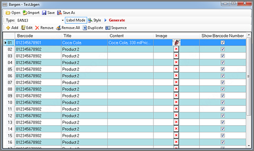 单击主屏幕上的条形码按钮,将打开用于输入条形码的窗口。您可以通过工具栏按钮分别填写每个条形码的信息。如果选择了多个条形码,则在单击“ 编辑”按钮时,将打开一个对话框窗口,您可以在其中指定条形码,标题,内容和/或是否显示所有条形码的条形码标签。您还可以利用序列按钮。单击它后,将打开一个对话框窗口,您可以通过该对话框创建一系列条形码。您应该输入条形码的起始编号,增量步长和所需的条形码数量。如果您也想输入前缀和后缀。例如,如果您输入12字头,100为起始号和341后缀,那么当您单击 插入按钮上的条形码12 100 341,12 110 341,…,12 250 341将被创建。您还可以设置要使用的数字系统的基数。默认情况下,它设置为十进制,但是您可以通过在“ 基数”字段中设置适当的值来轻松将其更改为二进制,八进制,十六进制或任何其他形式。支持从2到36的小数的所有数字系统。使用其他工具栏按钮,您可以将条形码保存在文件中,从文件中加载,删除当前选择的条形码或删除所有条形码。您可以从工具栏左侧的组合框中设置条形码的类型。