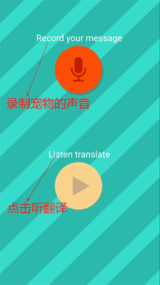 3、首先点击录音图案按钮,采集宠物的叫声,然后再点下方按钮听翻译,这样可以和宠物一起交流了。