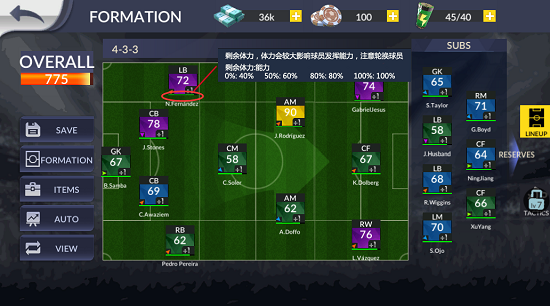 比赛开场前还有一键使用道具调整球员体力状态的按键,十分方便。什么?道具不够用了吗?快去试试升级俱乐部建筑加快道具的产出速度吧。