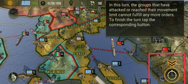 6、当右下角这个图标出现时,就表示在这个回合中,已经攻击或达到移动极限的团体不能再执行任何命令,要完成转弯则需要点击这个相应的按钮,最后成功消灭敌方军队即可获胜。