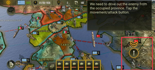 5、当板块周围出现了红色的线条,就表示可以进行攻击,点击敌人占领的区域,然后让周围的军队去支援正在打仗的地方。并且指定要攻击的敌军单位之后,我们还需要再次点击右下角按钮来确认命令。