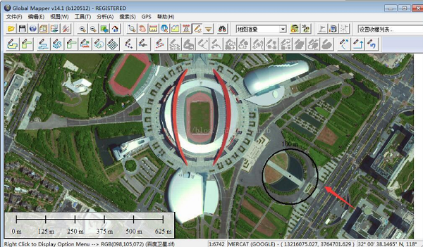 依次将下载的谷歌卫星地图和百度卫星地图加载到Global Mapper内,在地图上画一个圆,可以看到在百度卫星地图(图3)和谷歌卫星地图上(图4),所画的圆都在同一个地方,可以证明当前加载的百度卫星地图已经和谷歌卫星地图一样是无偏移的。