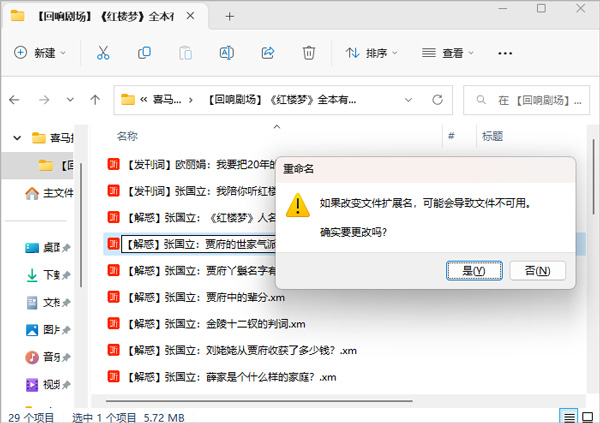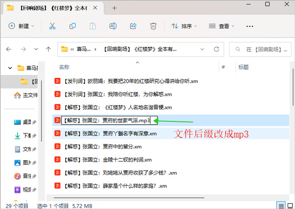 此时我们可以选择文件,按键盘f2键,对文件进行重命名,重命名时对文件前面的可以不动,但对文件后缀名需要改正为mp3,如下图所示