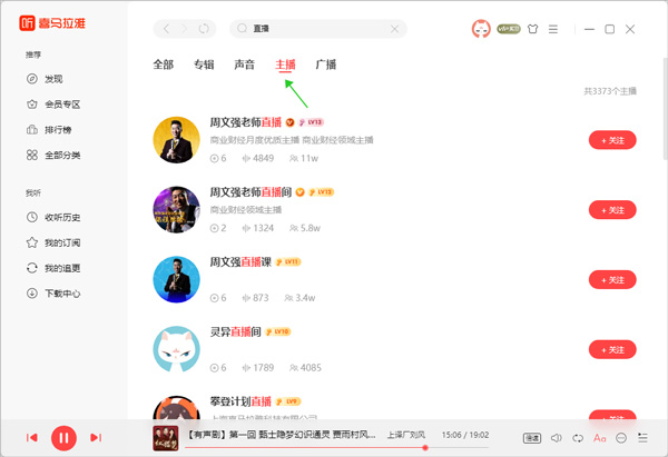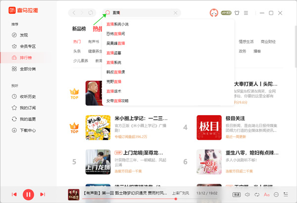 1、打开喜马拉雅电脑版后直接在顶部搜索框中输入 ”直播“ 后点击搜索按钮(下图绿色箭头所指)