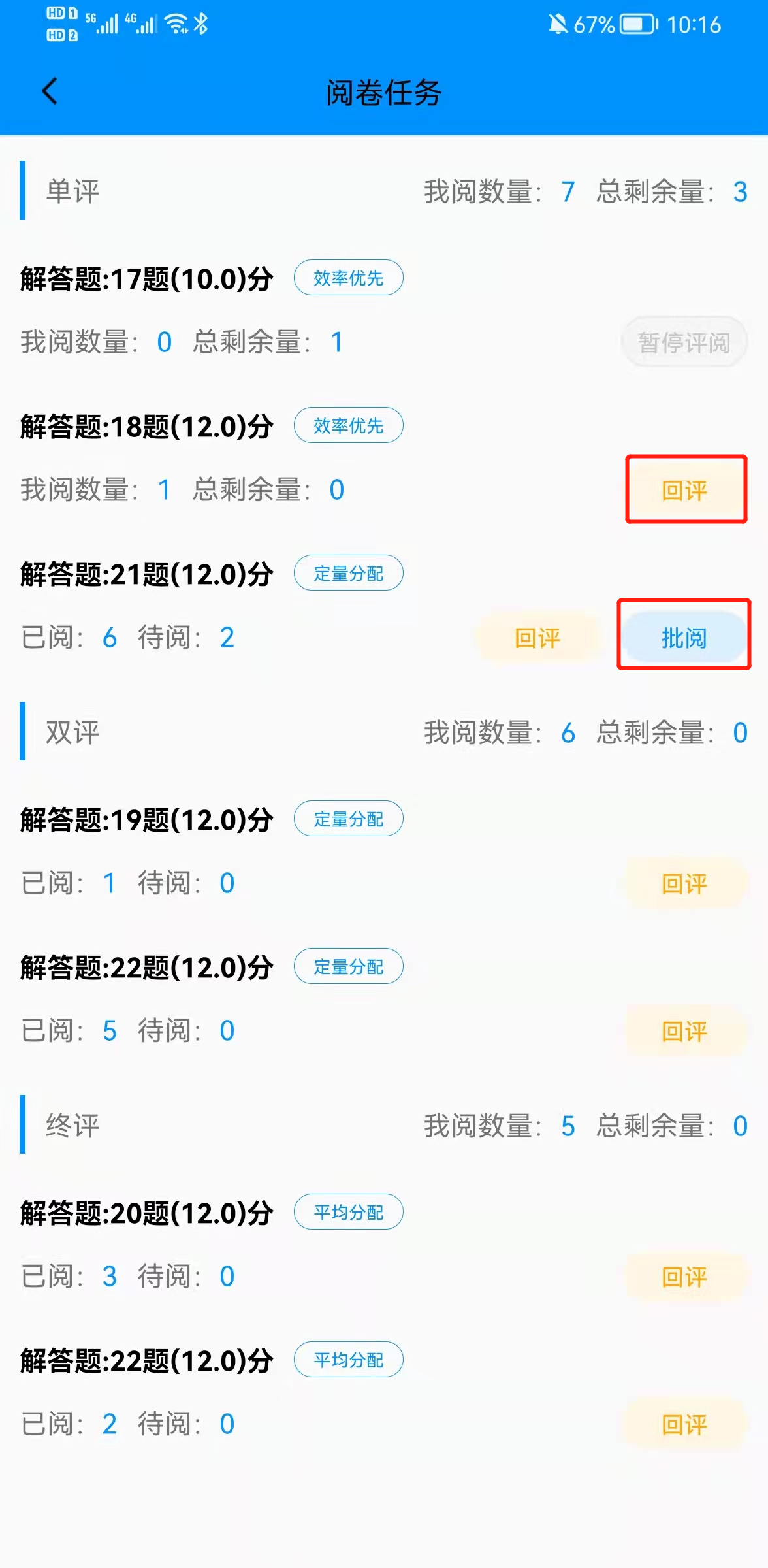 当任务分配方式是平均分配或定量分配时,“已阅”指该小题我已阅数量,“待阅”指该小题我还有多少试卷未阅;
