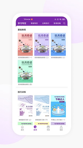 2、在曲库中,有教学专区,还有考级专区、古典专区、影视经典、动漫游戏、中国作品、玖月专辑和重奏合奏等等。