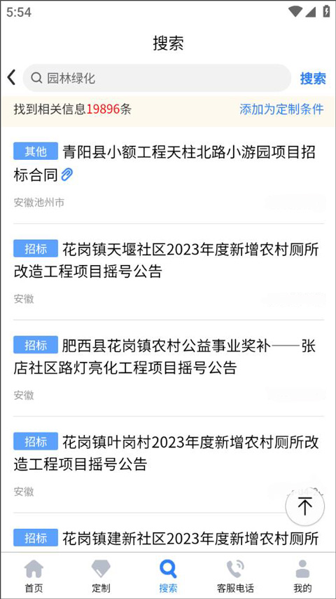 1、打开招标网app,主要有首页、定制、搜索、客服电话、我的等版块,在上方搜索框输入关键词或者点击下方搜索;