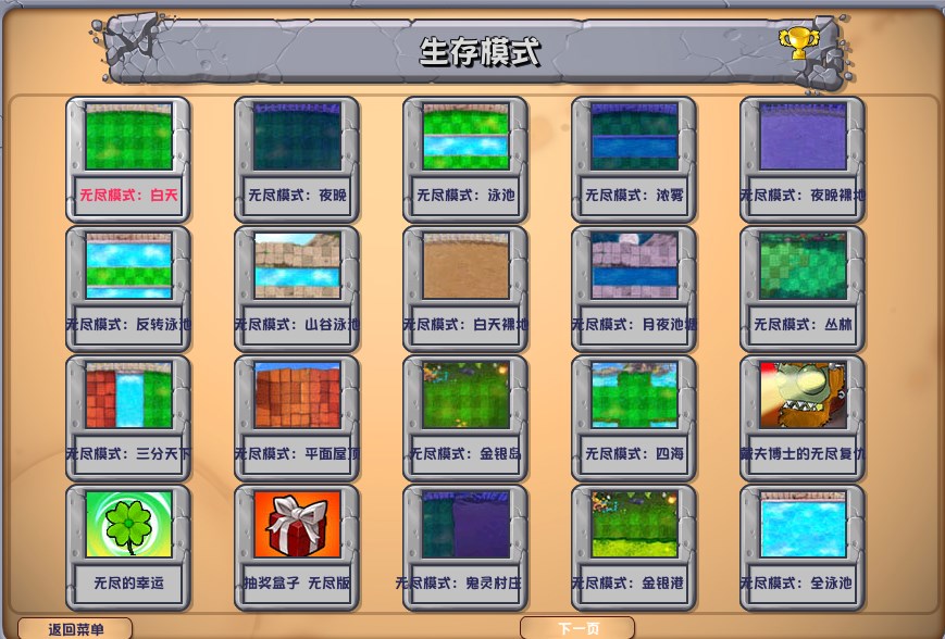 3、迷你游戏关卡丰富,分别有土星关卡,植物僵尸关卡,坚果保龄球关卡,种子雨等等,全部关卡总览看下图!