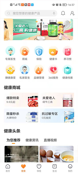 2、在健康界面中,为你提供了专属医生、商城、保险、血糖管理等等,并可以进行查看或查询。