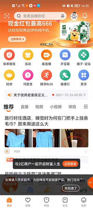 1、打开在本站下载的中国平安人寿保险官网app,在首页中为你提供了公告,推荐产品,还有便捷的常用的旺财,续期宝,问一声,进圈子,我的活动,我的产品等便捷服务。