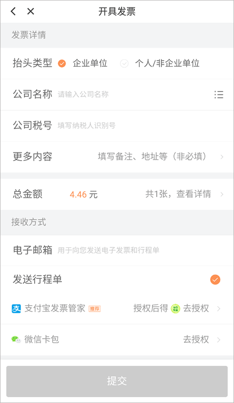 5、最后一步就需要填写发票抬头信息,以及接收方式后,点击提交即可。