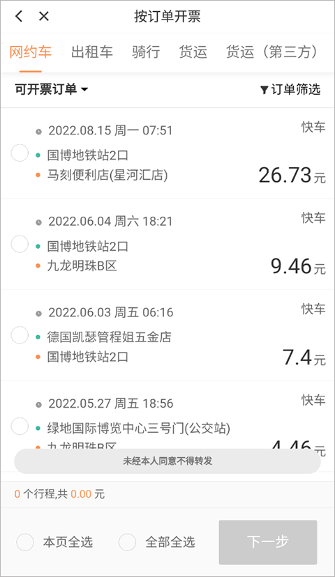 4、批量或点击选择你要开票的订单,点击“下一步”