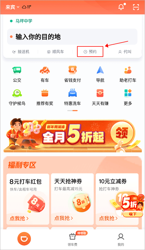 1、进到软件内,在首页打车界面点击“预约”图标。
