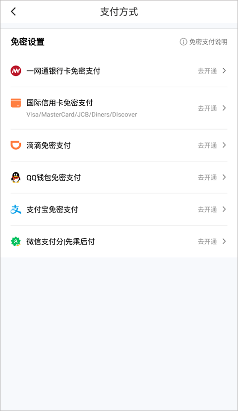 如想开启免密支付,选择想要开通的支付方式,点击【去开通】;
