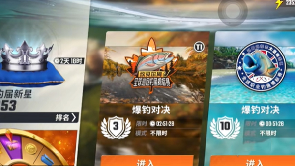 进入游戏主界面后,点击右下角的”渔场”,选择一个渔场进入。注意关注左下方的幸运加成,当显示增加捕获巨型鱼的几率时,进入渔场进行钓鱼,这样钓到稀有度较高的大鱼的概率会增加。